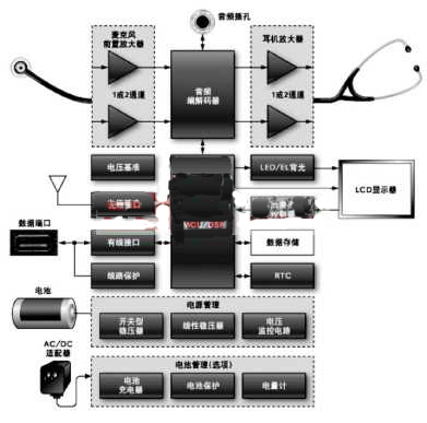 數(shù)字聽診器的基本目標(biāo)是保持聲學(xué)聽診器的外觀和感覺,但提高了聲音信號(hào)的檢測(cè)能力。另外,高端數(shù)字聽診器還提供了一些新功能,例如:錄音和回放,也可以提供直觀的數(shù)據(jù)顯示結(jié)果,并顯示在外設(shè)顯示器,如計(jì)算機(jī)監(jiān)視器。先進(jìn)的功能增強(qiáng)了醫(yī)師的診斷能力。數(shù)字聽診器在改進(jìn)性能的同時(shí),還要求維持現(xiàn)有聲學(xué)聽診器的外形(相同的外觀和感覺),這就需要使用小尺寸、低功耗的解決方案。