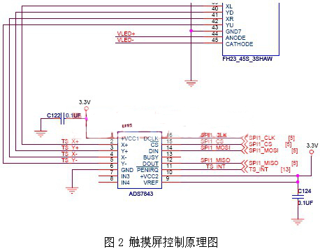 本文中手持式計算機采用四線電阻式觸摸屏,觸摸屏控制器采用ADS7843E,觸摸屏校準庫tslib采用五點校準。觸摸屏控制原理如圖2所示。