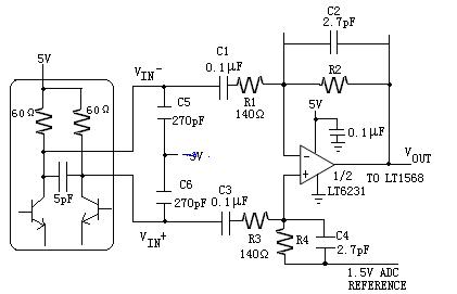 RF解調(diào)器采用了凌特公司的LT5516芯片,該芯片直接轉(zhuǎn)換解調(diào)器800MHzZH至1.5GHz的頻率范圍。LT5516超群的線性提供了對(duì)低電平信號(hào)的高靈敏度,即使在很大的干擾信號(hào)下也不會(huì)受到影響。運(yùn)算放大器采用了凌特公司的LT6231芯片,該芯片起一個(gè)差分至單端放大器的作用,用于驅(qū)動(dòng)低通濾波器的單端輸入。LT5516的差分I或Q輸出轉(zhuǎn)換為一個(gè)單端輸出的LT6231差分放大器。電路如圖所示。
