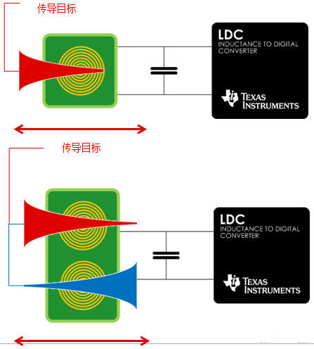 LDC也可以用來測量目標物體橫向運動的狀況。如下圖所示,當(dāng)一個楔形金屬目標掠過傳感線圈時,渦流損耗的變化便被記錄下來。如果采用兩個傳感線圈,那么目標物體與探測線圈之間距離的抖動誤差就可以通過差分的形式加以消除。