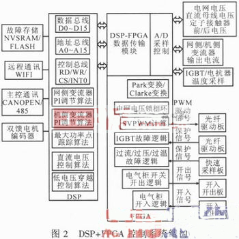 FPGA設(shè)計(jì)屬于數(shù)字電路硬件設(shè)計(jì),運(yùn)行速度相對較快,故一般將算法比較固定且對系統(tǒng)實(shí)時性和速度要求較高的算法模塊加入到FPGA,主要包括:A/D芯片控制、空間矢量脈寬調(diào)制(SVPWM)計(jì)算、Park與Clarke變換計(jì)算、PWM輸出控制、快速保護(hù)邏輯控制與開入開出邏輯控制。將需要經(jīng)常修改的軟件算法放到DSP中實(shí)現(xiàn),主要功能包括數(shù)據(jù)的存儲與調(diào)用、系統(tǒng)運(yùn)行控制、數(shù)據(jù)通訊、PI調(diào)節(jié)器控制、低電壓穿越控制等功能。FPAG通過控制ADS8364采樣得到傳感器數(shù)據(jù)進(jìn)入FPGA內(nèi)部的數(shù)據(jù)運(yùn)算單元,根據(jù)預(yù)置的Clarke與Park變換算法進(jìn)行運(yùn)算,得到正序與負(fù)序的ud,uq,id,iq,并將計(jì)算結(jié)果傳送給DSP;DSP調(diào)用直流穩(wěn)壓計(jì)算模塊、電流電壓閉環(huán)PI模塊、低電壓穿越檢測模塊對FPGA輸入的數(shù)據(jù)進(jìn)行計(jì)算,并將計(jì)算結(jié)果通過數(shù)據(jù)總線傳送給FPGA,F(xiàn)PGA將接收到的計(jì)算結(jié)果進(jìn)行Park反變換,并通過SVPWM模塊產(chǎn)生12路PWM波形分別來控制機(jī)側(cè)變流器和網(wǎng)側(cè)變流器IGBT開關(guān)器件開通與關(guān)斷,進(jìn)而控制變流器輸出所需的電壓波形。