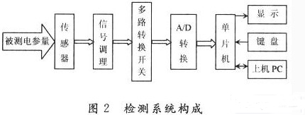 檢測(cè)系統(tǒng)構(gòu)成如圖2,被測(cè)量經(jīng)霍爾傳感器轉(zhuǎn)換為電壓信號(hào),經(jīng)信號(hào)調(diào)理電路和多路轉(zhuǎn)換開關(guān)選擇,通過A/D轉(zhuǎn)換器送給單片機(jī),單片機(jī)采用89C51,是該系統(tǒng)的主控器,鍵盤選用2×4鍵盤,用于選擇被測(cè)量的種類,采用數(shù)碼管或液晶顯示被測(cè)量的大小。