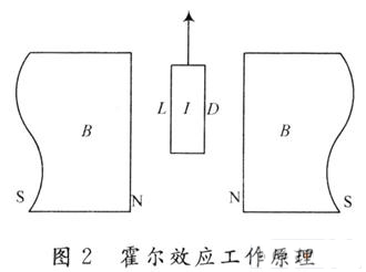 霍爾傳感器是利用霍爾效應(yīng)實(shí)現(xiàn)磁電轉(zhuǎn)換的一種傳感器。它具有靈敏度高,應(yīng)用廣泛的特點(diǎn)。其工作原理如圖2所示:一塊半導(dǎo)體薄片,其長(zhǎng)度為L(zhǎng),寬度為B,厚度為D,置于磁感應(yīng)強(qiáng)度為B的磁場(chǎng)中,在相對(duì)的兩邊通以控制電流I,且磁場(chǎng)方向與電流方向正交,則在半導(dǎo)體的兩邊將產(chǎn)生一個(gè)與控制電流和磁感應(yīng)強(qiáng)度乘積成正比的電勢(shì)U,該電勢(shì)即為霍爾電壓,用UH表示,即UH=KHIB,其中KH為霍爾元件的靈敏度,半導(dǎo)體薄片就是霍爾元件。