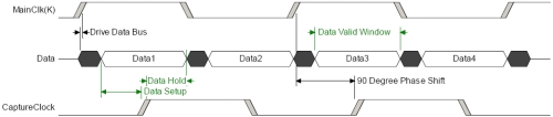在同步存儲(chǔ)器系統(tǒng)例如QDR SRAM中,數(shù)據(jù)是與時(shí)鐘同步的,所以存儲(chǔ)器數(shù)據(jù)要使相位必須旋轉(zhuǎn)90度。這種相位旋轉(zhuǎn)通常在有效數(shù)據(jù)窗口中進(jìn)行中心調(diào)整時(shí)鐘,是一個(gè)重要的QDR準(zhǔn)確數(shù)據(jù)采集的設(shè)計(jì)特點(diǎn)(見(jiàn)下文圖2)。如果要改變時(shí)鐘中心,我們可以通過(guò)對(duì)板上FPGA的PLL網(wǎng)絡(luò)進(jìn)行簡(jiǎn)單的延時(shí)時(shí)鐘信號(hào)來(lái)達(dá)到。