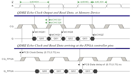 首先,我們使用TimingDesigner通過(guò)存儲(chǔ)器數(shù)據(jù)表為QDR SRAM創(chuàng)造一個(gè)圖表(圖4)。我們利用此圖確定存儲(chǔ)器與有效數(shù)據(jù)窗口中的時(shí)鐘和數(shù)據(jù)信號(hào)時(shí)序的關(guān)系。目的是精確定義存儲(chǔ)器的信號(hào)關(guān)系,并在PCB到FPGA的設(shè)計(jì)中傳遞這種關(guān)系。