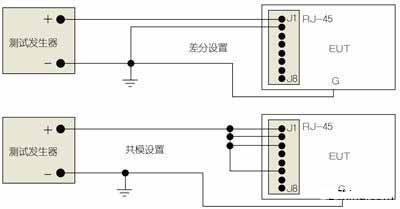檢查設(shè)備的EFT抗擾性(按照IEC 61000-4-4標(biāo)準(zhǔn))與對共模雷擊浪涌所做的測試非常相似。在圖3所示的比較典型的配置中,所有導(dǎo)體(或引腳)均是電容性耦合至測試發(fā)生器的正極端,且對于GND顯示“激增”。如果數(shù)據(jù)線均衡良好,在組對之間將不會有差分能量,但是變壓器的耦合電容會再次將共模能量轉(zhuǎn)移到驅(qū)動端,即使是以較低的水平。