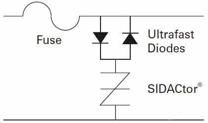 如果使用ADSL線路,可采用單個GDT或SIDACtor提供保護,在需要電源故障保護的情況下,還應(yīng)配備一個熔斷器。在此類應(yīng)用中,最好采用微電容SIDACtor以減少信號失真。如果電容值太高,可安裝反并聯(lián)連接的一對離散超快開關(guān)二極管(圖1),將總電容降低至15pF,也可以采用內(nèi)置上述二極管的SDP或SEP SIDACTOR系列。