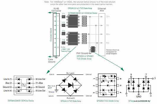 圖2:用于建筑物之間的以太網(wǎng)線路可采用超快TVS二極管、熔斷器,以及超低電容二極管陣列實現(xiàn)保護