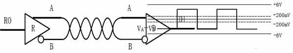 RS-485數(shù)據(jù)信號(hào)采用差分傳輸方式,收、發(fā)端通過平衡雙絞線將A-A與B-B對應(yīng)相連。當(dāng)線路A高于線路B電平(VA-VB> +200mV)時(shí),接收端輸出為邏輯高電平(RO=1);當(dāng)線路A低于線路B電平(VA-VB<-200mV)時(shí),接收端輸出為邏輯低電平(RO=0)。當(dāng)驅(qū)動(dòng)器的輸入端邏輯電平為高(DI=1)時(shí),線路A電平高于線路B電平;當(dāng)驅(qū)動(dòng)器的輸入端邏輯電平為低(DI=0)時(shí),線路A電平低于線路B電平。見圖1。