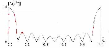 其中,是由N 節(jié)延時單元組成的梳狀濾波器,H1(z)的幅值響應(yīng)由許多頻率間隔相同的通帶和阻帶組成,它只許一些特定頻率范圍的信號通過而阻止另一些特定頻率信號通過[4]。H(z)的頻率響應(yīng)為: