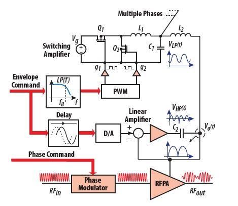 但如何能夠產(chǎn)生所要求的快速變化、帶寬處于數(shù)十兆赫茲(MHz)范圍的供電電壓?我們可以通過不同的方法來實(shí)現(xiàn)。其中一個(gè)方法是使用如圖2所示的混合式線性放大器和多相降壓轉(zhuǎn)換器,其中降壓轉(zhuǎn)換器只給負(fù)載組件/系列的傅里葉大功率、低頻部分供電。我們也有討論其他實(shí)現(xiàn)方法,如使用升壓轉(zhuǎn)換器或S類放大器。無論使用哪一個(gè)方法,氮化鎵技術(shù)可以推動包絡(luò)跟蹤轉(zhuǎn)換器和寬帶RFPA設(shè)計(jì)。