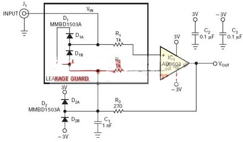 在某些測量應(yīng)用中,如pH值(酸度)和生物電勢需要高阻抗緩沖放大器。雖然有幾個半導(dǎo)體制造商提供具有低偏置和輸入偏置電流特點的放大器芯片,配上傳感器電纜可能會因為ESD(靜電放電)對放大電路造成損害。圖1顯示一種不令人滿意的方法實現(xiàn)ESD保護。電阻R1抑制ESD的放電電流,而二極管D1A 和D1B鉗住放大器IC1的輸入到供電電源軌。不幸的是,當并聯(lián)pH值傳感器的為400MΩ輸入阻抗時,即使采用低漏電流二極管,如Fairchild公司的MMBD-1503A,仍引入很大的偏置電壓。