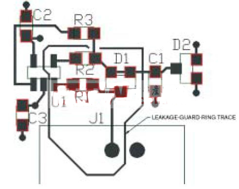封裝電路時,需要特別注意電路板的布局。電路板介電性能的缺陷會給寄生漏電流提供路徑。在電路板的兩面敷銅形成保護環(huán),可以在電路高阻抗節(jié)點周圍轉(zhuǎn)移漏電流(圖3)。