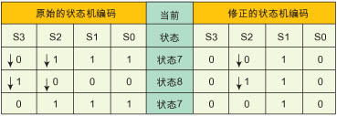 如果狀態(tài)機采用格雷碼而不是二進制碼來設(shè)計,則這兩個狀態(tài)之間的轉(zhuǎn)換所需的邏輯轉(zhuǎn)換量將降至僅為一位。另外,如果將狀態(tài)7和8分別編碼為0010和0011,亦可達到同樣的效果。