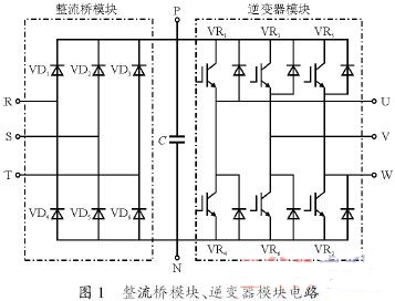檢 查前,拆下逆變模塊、整流模塊與外部連接的電源線(R、S、T)和與電動(dòng)機(jī)連接的接線(U、V、W)端子,將萬(wàn)用表?yè)艿絉伊100贅擋。分別測(cè)量R、S、 T、U、V、W、P 和N 處,變換萬(wàn)用表表筆,測(cè)量其導(dǎo)通狀態(tài),便可判斷它們是否性能良好。整流橋模塊、逆變器模塊電路如圖1所示,測(cè)試結(jié)果見表1。