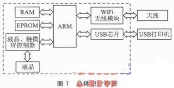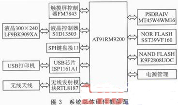 為了實現(xiàn)打印模塊與USB打印機的通信,選用Philips公司的ISP1161A1芯片作為USB主機控制器。ISP1161A1的主機控制器部分符合USB1.1規(guī)范,支持全速(12Mbi/s)和低速(1.5 Mbi/s)的數(shù)據(jù)傳輸。ISP1161A1提供兩個下行端口,可與USB打印機進行連接。WiFi無線模塊采用的是G—SKY無線發(fā)射模塊,其發(fā)射芯片是Realtek公司的RTL8187芯片。液晶采用320×240的LFUBK909XA彩色(256色)點陣圖形液晶模塊,液晶控制器芯片為S1D13503。該液晶屏上帶有觸摸屏,采用觸摸屏控制器FM7843進行A/D轉(zhuǎn)換,轉(zhuǎn)換結(jié)果輸出到AT91RM9200處理器。系統(tǒng)總體硬件框圖如圖3所示。