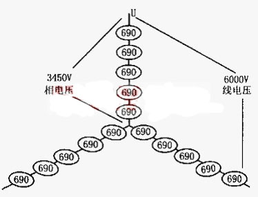 單元串聯(lián)多電平PWM電壓源型變頻器,采用若干個低壓PWM變頻功率單元串聯(lián)的方式實現直接高壓輸出,該變頻器對電網諧波污染小,諧波輸入電流很低,輸入功率因數高,不必采用輸入諧波濾波器和功率因數補償裝置。如以6kV的輸出電壓等級為例(如圖2),電網電壓經過二次側多重化的隔離變壓器降壓后向功率單元供電,功率單元為三相輸入、單相輸出的交一直一交PWM電源型逆變器結構。將相鄰功率單元的輸出端串接起來,形成Y聯(lián)結構,實現變壓變頻的高壓直接輸出,供給高壓電動機。