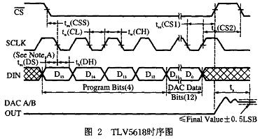 TLV5618是TI公司帶緩沖基準(zhǔn)輸入(高阻抗)的雙路12 位電壓輸出DAC,通過CMOS 兼容的3線串行總線實(shí)現(xiàn)數(shù)字控制。器件接收16 位命令字,產(chǎn)生兩路D/A模擬輸出。TLV5618只有單一I/O周期,由外部時(shí)鐘SCL K決定,延續(xù)16 個(gè)時(shí)鐘周期,將命令字寫入片內(nèi)寄存器,完成后即進(jìn)行D/A轉(zhuǎn)換。TLV5618讀入命令字是從CS的下降沿開始有效,從下一SCLK的下降沿開始讀入數(shù)據(jù),讀入16位數(shù)據(jù)后即進(jìn)入轉(zhuǎn)換周期,直到下次出現(xiàn)CS的下降沿。 其操作時(shí)序圖如圖2 所示。