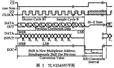 TLC2543是TI公司的帶串行控制和11個(gè)輸入端的12 位、開關(guān)電容逐次逼近型A/D轉(zhuǎn)換器。 片內(nèi)轉(zhuǎn)換器有高速、高精度和低噪音的特點(diǎn)。 TLC2543工作過程分為兩個(gè)周期:I/O周期和轉(zhuǎn)換周期。I/O周期由外部時(shí)鐘SCLK決定,延續(xù)8、12或16個(gè)時(shí)鐘周期,同時(shí)進(jìn)行兩種操作: 在SCLK上升沿以MSB方式輸入8位數(shù)據(jù)到片內(nèi)寄存器;在SCLK下降沿以MSB 方式輸出8、12、16位轉(zhuǎn)換結(jié)果。轉(zhuǎn)換周期在I/O周期的最后一個(gè)SCLK下降沿開始,直到EOC信號(hào)變高,指示轉(zhuǎn)換完成。 為了與TLV5618的I/O周期一致,采用了MSB方式,使用CS的16 時(shí)鐘傳送的時(shí)序。其操作時(shí)序如圖3 所示。