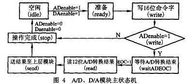 系統(tǒng)設(shè)計(jì)中,將AD、DA操作封裝成一單獨(dú)模塊,由上層控制模塊輸出命令字及控制信號(hào)啟動(dòng)本模塊的相應(yīng)操作,操作完成后(進(jìn)入idle狀態(tài)) ,本模塊發(fā)出相應(yīng)狀態(tài)信號(hào)至上層模塊。