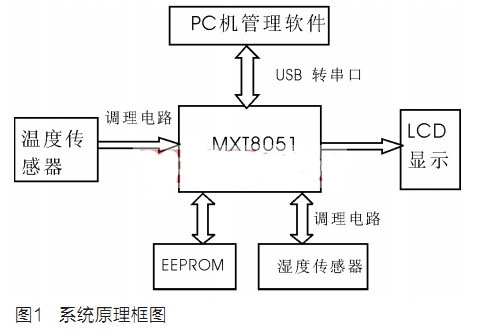 系統(tǒng)基于MXT8051混合信號(hào)微處理器來(lái)開發(fā),兼具低成本和高性能,主要包括六個(gè)部分:MXT8051處理器、溫度傳感器及調(diào)理電路、濕度傳感器及調(diào)理電路、LCD顯示和PC機(jī)管理軟件,系統(tǒng)原理框圖如圖1所示。