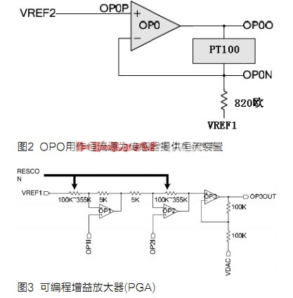 溫度測(cè)量采用恒流源測(cè)溫方式,測(cè)量調(diào)理電路如圖2、圖3所示,采用MXT8051的片上資源。如圖2所示,利用OP0、VREF1、VREF2和外部電阻820Ω構(gòu)成恒流源為傳感器PT100供電。 如圖3所示,OP1、OP2與可控電阻網(wǎng)絡(luò)一起組成一個(gè)差分輸入的PGA。OP3起調(diào)零的作用。兩個(gè)可調(diào)電阻由RESCON控制,且具有相同的阻值,調(diào)節(jié)范圍為100~355kΩ。
