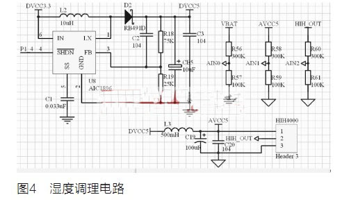 本文采用的濕度傳感器是Honeywell公司生產(chǎn)的HIH-4000。這是具有激光調(diào)整互換型容性變化的單片集成電路,其輸出電壓與RH值呈線性關(guān)系,精度高,響應(yīng)時(shí)間快,漂移小, 典型工作電流僅為200mA,令HIH-4000 系列非常適合低功耗,電池工作的系統(tǒng)。在標(biāo)準(zhǔn)工作電壓(DC5V)和標(biāo)準(zhǔn)室溫(25℃)下,隨著RH值從0%到100%,對(duì)應(yīng)的輸出電壓從0.96V到3.90V。本記錄儀使用單節(jié)鋰電池供電,而HIH-4000最佳工作電壓是5V,因此采用AIC1896進(jìn)行升壓。使用AD通道1測(cè)量HIH-4000的工作電壓,AD通道2測(cè)量濕度輸出電壓,因?yàn)锳D的參考電壓是1.26V,所以需要用300kΩ和100kΩ電阻進(jìn)行分壓。濕度調(diào)理電路如圖4所示。