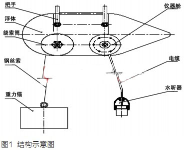 本裝置采用雙體流線型玻璃鋼結(jié)構(gòu),中間裝配繞索筒和電路儀器艙,具有外形小,重量輕,浮力大,布放方便的特點。結(jié)構(gòu)示意圖如圖1所示。