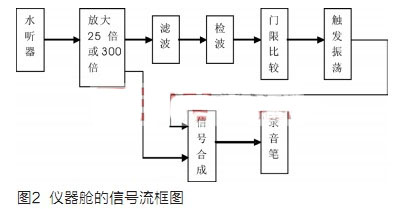 電路儀器艙用來實現(xiàn)對換能器信號的處理,最終將收取到的爆炸信號記錄到錄音筆中。電路儀器艙由放大電路、頻率變換合成電路、錄音筆,供電裝置組成。儀器艙的信號流框圖見圖2。