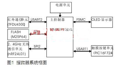 搜器系統(tǒng)主要由電源模塊、主控制器模塊、2.4GHz無線通信模塊、紅外通信模塊、FLASH存儲(chǔ)器模塊、OLED顯示模塊和觸摸按鍵模塊組成,系統(tǒng)框圖如圖1所示。