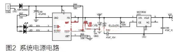 采用鋰電池做為系統(tǒng)電源,電池充電管理芯片選用CN3083,圖2所示是以500mA電流4.2V電壓進(jìn)行恒壓充電的電路圖。圖2中發(fā)光二極管D5發(fā)光時(shí)表明充電正在進(jìn)行,D6發(fā)光時(shí)表明充電已經(jīng)結(jié)束。鋰電池通過LDO芯片MD73R30向系統(tǒng)提供穩(wěn)定的3.3V電壓,該芯片有使能控制引腳CE,可以通過將圖中POWER_EN置為低電平關(guān)閉MD73R30以節(jié)省電能。