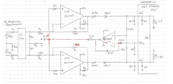 運(yùn)放輸出端是一對(duì)差分RLC濾波器。選擇器件參數(shù)時(shí)首先是選擇符合ADC輸入特性的電容值。電感值較小更合適,以免電感自身諧振頻率落在濾波器通帶之內(nèi)。串聯(lián)電阻的作用是將運(yùn)放與其感性/容性負(fù)載隔離,保持運(yùn)放穩(wěn)定,還能對(duì)ADC輸入起到一定的保護(hù)作用,避免過(guò)大的電流流入ADC,但是會(huì)造成一定的信號(hào)衰減。最后是一個(gè)并聯(lián)電阻,實(shí)際上ADC內(nèi)部輸入端也有這樣一個(gè)電阻,這兩個(gè)電阻并聯(lián)將阻值減半。這個(gè)電阻感應(yīng)信號(hào)的共模電壓,而又對(duì)信號(hào)本身不產(chǎn)生影響。這個(gè)濾波器為二階低通濾波器,截止頻率102MHz,Q值0.9。這樣信號(hào)會(huì)有輕微過(guò)沖,但是二階-3dB帶寬123MHz。結(jié)合KAD5610P-25,雙10bit,250MSPS FemtoCharge ADC,濾波器可以有效的濾除信號(hào)鏈及放大器帶來(lái)的噪聲。在采樣率250MSPS時(shí),ADC輸入DC電流大約是1.1mA,而從放大器到ADC之間的阻抗為60.4歐姆,那么DC電壓降為66.4mV。這個(gè)電壓降可以用ISL28113組成的反饋補(bǔ)償網(wǎng)絡(luò)來(lái)補(bǔ)償。