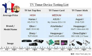 在測(cè)試概念上,我們首先研究過(guò)歐、美、亞洲等各大消費(fèi)電子市場(chǎng),發(fā)現(xiàn)到以機(jī)頂盒(TV Set Top Box)、電視卡(TV Tuner Card)以及電視棒(TV Tuner Stick)占信號(hào)接受器產(chǎn)品的最大份額,因此我們選擇這三個(gè)類型的產(chǎn)品為范本,并從每個(gè)類型中各挑選出三家知名廠牌的產(chǎn)品作為測(cè)試對(duì)象。這些所有產(chǎn)品都將與自今年五月份從巴黎實(shí)地錄制回來(lái)的42臺(tái)無(wú)線電視信號(hào)(包含模擬與數(shù)字頻道),通過(guò)射頻播放儀器進(jìn)行實(shí)際的播放測(cè)試,并通過(guò)相關(guān)的功能指標(biāo)來(lái)檢視產(chǎn)品在各個(gè)方面的表現(xiàn)。在下面的文章中,我們將先介紹檢視產(chǎn)品品質(zhì)的四大功能指標(biāo),另外由于這三種類型產(chǎn)品在設(shè)計(jì)架構(gòu)及功能訴求上皆有所不同,我們也將在第二部份整理出它們?cè)跍y(cè)試過(guò)程中所發(fā)現(xiàn)的實(shí)際問(wèn)題。