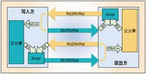 從邏輯上說,只需要讀出方把自己的記分牌的信息(清位信息)傳送給寫入方,同時(shí)寫入方把自己的記分牌的信息(置位信息)傳送給讀出方就可以了,即只要構(gòu)成兩條邏輯通道就可以滿足需求。但是,在硬件上的實(shí)現(xiàn)卻要比這種只從邏輯上的思考要復(fù)雜。由于讀寫雙方有可能處在不同的時(shí)鐘域,所以當(dāng)讀寫雙方交換信息的時(shí)候就需要處理信號(hào)采樣的亞穩(wěn)態(tài)情況。我們使用下面的方法來處理信號(hào)亞穩(wěn)態(tài)。