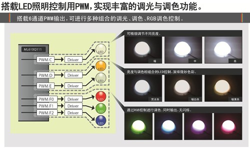 ROHM旗下的LAPIS Semiconductor開發(fā)出可通過精細(xì)控制實(shí)現(xiàn)豐富色彩與亮度的全彩LED照明用8位低功耗微控制器“ML610Q111/ML610Q112”。