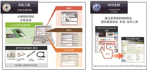 另外,具備完善的服務(wù)支持體制,還為客戶準(zhǔn)備了可輕松開始評價(jià)的配套參考板和軟件開發(fā)環(huán)境,客戶只需從LAPIS Semiconductor官網(wǎng)進(jìn)行用戶登錄,即可使用各種用戶手冊和工具。