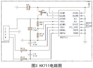 圖3為HX711構(gòu)成的稱重信號調(diào)理轉(zhuǎn)換電路,通道A與傳感器相連,管腳PD_SCK和DOUT組成串口通訊線,用來輸出數(shù)據(jù),選擇輸入通道和增益。