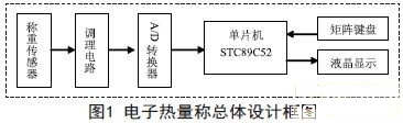 稱重傳感器感應(yīng)被測重力,本設(shè)計(jì)中選用電阻應(yīng)變式壓力傳感器作為電子稱稱重傳感器,當(dāng)有垂直壓力作用時(shí),傳感器將電阻值變化轉(zhuǎn)化成微弱的毫伏級電壓信號輸出。該電壓信號經(jīng)過放大電路放大后輸入模擬/數(shù)字(A/D)轉(zhuǎn)換器,轉(zhuǎn)換成數(shù)字信號再輸出到單片機(jī)進(jìn)行處理。單片機(jī)根據(jù)矩陣鍵盤輸入的熱量信息,把電子熱量稱得到的結(jié)果輸出液晶顯示器顯示。系統(tǒng)總體設(shè)計(jì)如圖1所示。