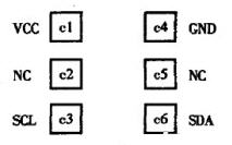 IC 卡 是將 一塊集成電路芯片鑲嵌在塑料基片中,封裝為卡片形式,其芯片具有寫人數(shù)據(jù)和存儲數(shù)據(jù)的能力。我們使用的是美國ATMEL公司生產(chǎn)AT24COIA存儲器型IC 卡。串行EEPROM AT24COIA的容量為1Kb ( 128x 8 位),擦寫次數(shù)為100001)周期,數(shù)據(jù)保存期可長達100年。這種IC卡所使用的模塊符合ISO/IEC7816協(xié)議,其觸點如圖1所示。這里cI(VCC)為電源端;c2(NC)未用,c3(SCL)為串行時鐘輸人端,c4 (GND)為接地端,c5(NC)未用;c6(SDA)為串行數(shù)據(jù)輸人/輸出端。