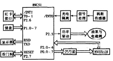 本加油機控制系統(tǒng)由單片及存儲器、測量及控制、IC卡接口、鍵盤及顯示、看門狗等部分所組成,其硬件原理框圖如圖2所示。