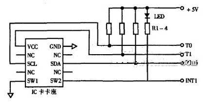 根據(jù) IC卡的電氣特性設計的IC卡接口電路原理圖見圖3。其中TO(單片機作為常規(guī)輸出)提供串行時鐘輸人信號;串行I/0通過單片機的P2.6 實現(xiàn);TI(8 9C51作為常規(guī)輸人)檢測IC卡的供電情況,為保護IC卡我們采用了限流供電措施;卡座中有否IC卡由單片機INT1(同樣作為常規(guī)輸人)來檢測,并且,當IC卡插人后微動開關SWi一SW2吸合,LED亮,反之LED滅。