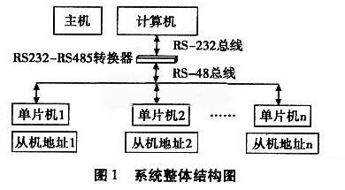 系統(tǒng)中計(jì)算機(jī)PC作為主機(jī),AVR單片機(jī)作為從機(jī),采用RS-485工業(yè)現(xiàn)場(chǎng)總線通信。由于計(jì)算機(jī)的串口采用RS232總線標(biāo)準(zhǔn),因此在主機(jī)的串行通信端口必須增加RS485-RS232電平轉(zhuǎn)換器,在計(jì)算機(jī)串行端口由該電平轉(zhuǎn)換器實(shí)現(xiàn)RS-232電平與RS-485電平轉(zhuǎn)換,主機(jī)與從機(jī)通過MOD-BUS通信協(xié)議在RS-485總線上進(jìn)行數(shù)據(jù)通信和交換,在整個(gè)RS-485總線上最多可以接255臺(tái)從機(jī)。系統(tǒng)的總體結(jié)構(gòu)如圖1所示。