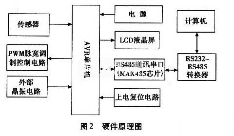 整個(gè)硬件電路包括:PC機(jī)、RS485-RS232電平轉(zhuǎn)換器、電源、復(fù)位電路、晶振電路、AVR單片機(jī)控制系統(tǒng)。本系統(tǒng)上位機(jī)由PC機(jī)和串口組成,下位機(jī)由兩個(gè)單片機(jī)控制系統(tǒng)組成。兩個(gè)從機(jī)設(shè)備地址為01和02,每個(gè)單片機(jī)系統(tǒng)由Atmega32單片機(jī),TSl2864A-3型LCD液晶顯示器,傳感器,PWM脈寬調(diào)制控制電路組成。下位機(jī)基于Atmega32單片機(jī),通過傳感器對(duì)采集數(shù)據(jù)再經(jīng)過A/D轉(zhuǎn)換后在LCD液晶屏顯示,Atmega32單片機(jī)帶有MAX485串口,通過RS-485總線與上位機(jī)通訊,系統(tǒng)的總體硬件原理圖如圖2所示。