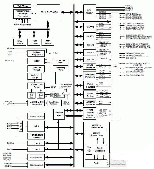 Enhanced peripherals include low power pulse counters running in sleep mode designed for pulse counting in AMR applications and a unique Time of Flight ranging engine, allowing accurate location services to be implemented on wireless sensor networks. It also includes a 4-wire I2S audio interface, to interface directly to mainstream audio CODECs, as well as conventional MCU peripherals.