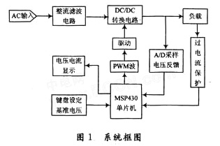本開關穩(wěn)壓電源是以MSP430F449為主控制器件,它是TI公司生產的16位超低功耗特性的功能強大的單片機,其低功耗的優(yōu)點有利于系統(tǒng)效率高的要求,且其ADC12是高精度的12位A/D轉換模塊,有高速、通用的特點。這里使用MSP430完成電壓反饋的PI調節(jié)WM波產生,基準電壓設定;電壓電流顯示;過電流保護等。