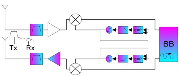 這種無線通信系統(tǒng)必須在不降低接收模式中誤碼率(BER)的情況下傳輸數(shù)據。為減輕濾波器的負擔,TX頻帶與RX頻帶之間存在一定的間隙,但載波需要將其降至最小。通常情況下,TX頻帶與RX頻帶的間隙在50MHz到100MHz之間。
