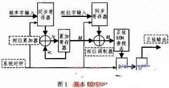 從本質(zhì)上看,DDS是一個恒定高頻率運行的多位計數(shù)器。在溢出時,通過利用一個多位控制字來設(shè)置計數(shù)器步進的尺寸,允許計數(shù)器過零。計數(shù)器的高階位用來尋址存儲設(shè)備,該設(shè)備保持生成的一個波形周期的數(shù)字記錄。高頻時鐘每前進一單位,計數(shù)器便步進一次,存儲器也將生成一個新的地址字,而新的波形數(shù)據(jù)值將會發(fā)送到DAC.DDS主要有3個優(yōu)點:1)輸出信號的頻率精度可以達到作為發(fā)生器參考信號使用的晶體控制振蕩器的水平;2)DDS發(fā)生器可以生成非常高的頻率精度;3)如果有RAM波形存儲器,那么DDS函數(shù)發(fā)生器可以重現(xiàn)幾乎任何波形。