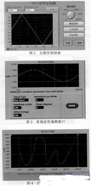 圖2為虛擬儀器上位機主面板,通過串口設(shè)置窗口選擇通信端口,采用cluster捆綁各操作類型并通過case結(jié)構(gòu)判斷所選操作,選擇常規(guī)波形、公式波形及手繪波形會分別彈出對應(yīng)的編輯窗口顯示波形數(shù)據(jù)。如圖3和圖4所示,為選擇常規(guī)波形和手繪波形彈出的波形參數(shù)設(shè)置對話框,設(shè)置完相應(yīng)的波形后,單擊done按鈕確認(rèn)。設(shè)置完波形后,可以點擊保存波形數(shù)據(jù),把繪制好的波形以二進制文本形式進行保存。