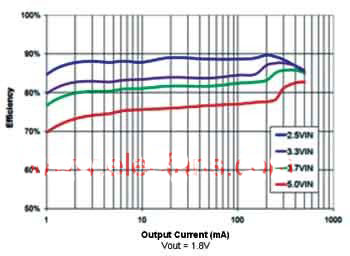 這種調(diào)節(jié)的缺點(diǎn)是模塊的輸出電壓固定,然而可變輸出電壓又會(huì)導(dǎo)致無(wú)源元件的匹配不平衡。因而,可以提供具有一定輸出電壓的不同模塊來(lái)解決問(wèn)題。首先推出的模塊的輸出電壓為1.8V,Vin為2.3~5.5V。這一電壓范圍是單一可充電電池、AA和AAA雙電池盒,以及單一3V鋰離子電池的理想選擇。