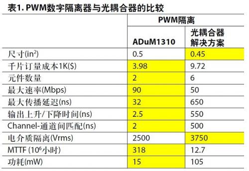 對功率級進行脈沖寬度調(diào)制,這是所有電機驅(qū)動的核心所在。開關(guān)頻率范圍一般為10 kHz-20 kHz。在優(yōu)化控制性能時,對脈沖寬度、死區(qū)時間和通道間延遲的精密控制顯得至關(guān)重要。在為PWM控制信號選擇適當?shù)母綦x器件時,數(shù)字隔離器在性能和成本兩個方面都要遠遠優(yōu)于同級別的光耦合器選項(見表1中的比較)。